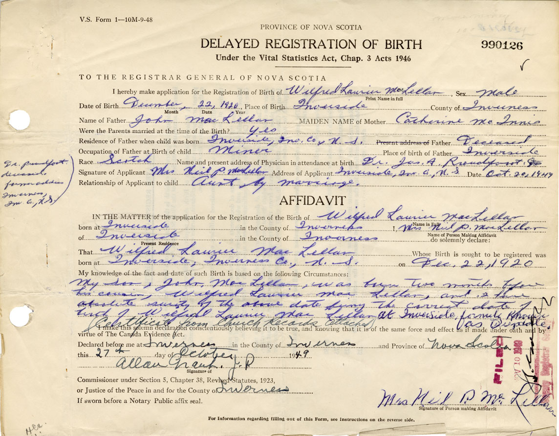 I hereby make application for the Registration of Birth of Wilfred LaurierMacLellan Sex Male