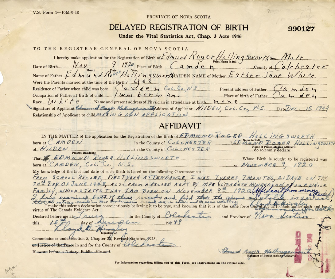 Signature of Applicant Edmund Roger Hollingsworth Address of Applicant Hilden Date December 15, 1949