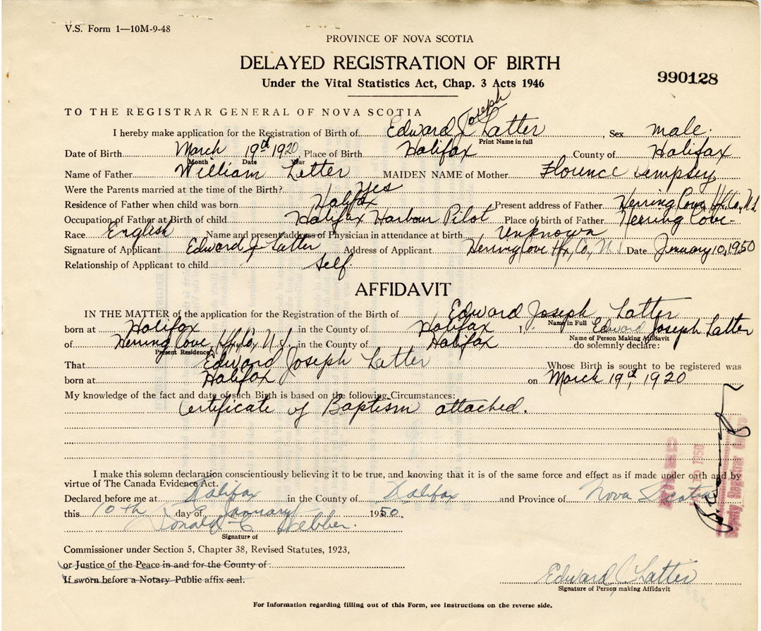 Signature of Applicant Edward J. Latter Address of Applicant Herring Cove Date January 10, 1950