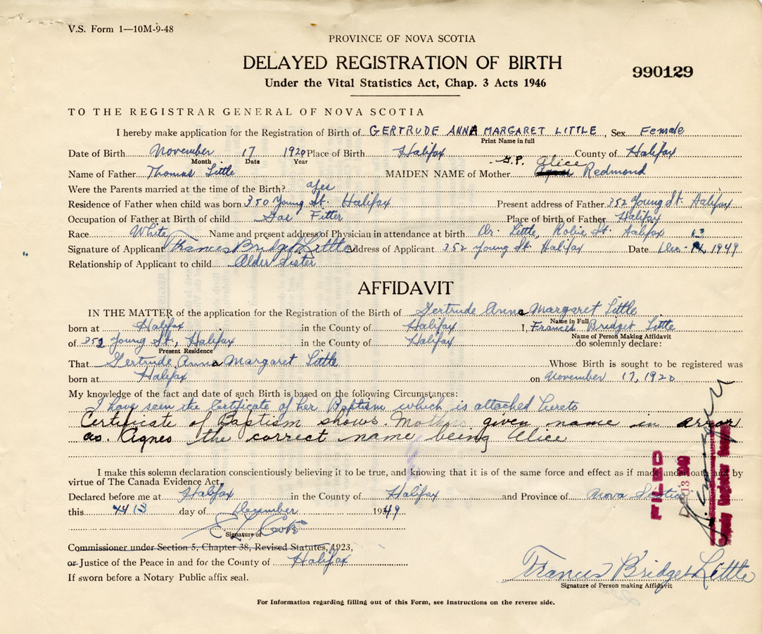 Signature of Applicant Frances Bridget Little Address of Applicant 352 Young St. Halifax Date December 13, 1949
