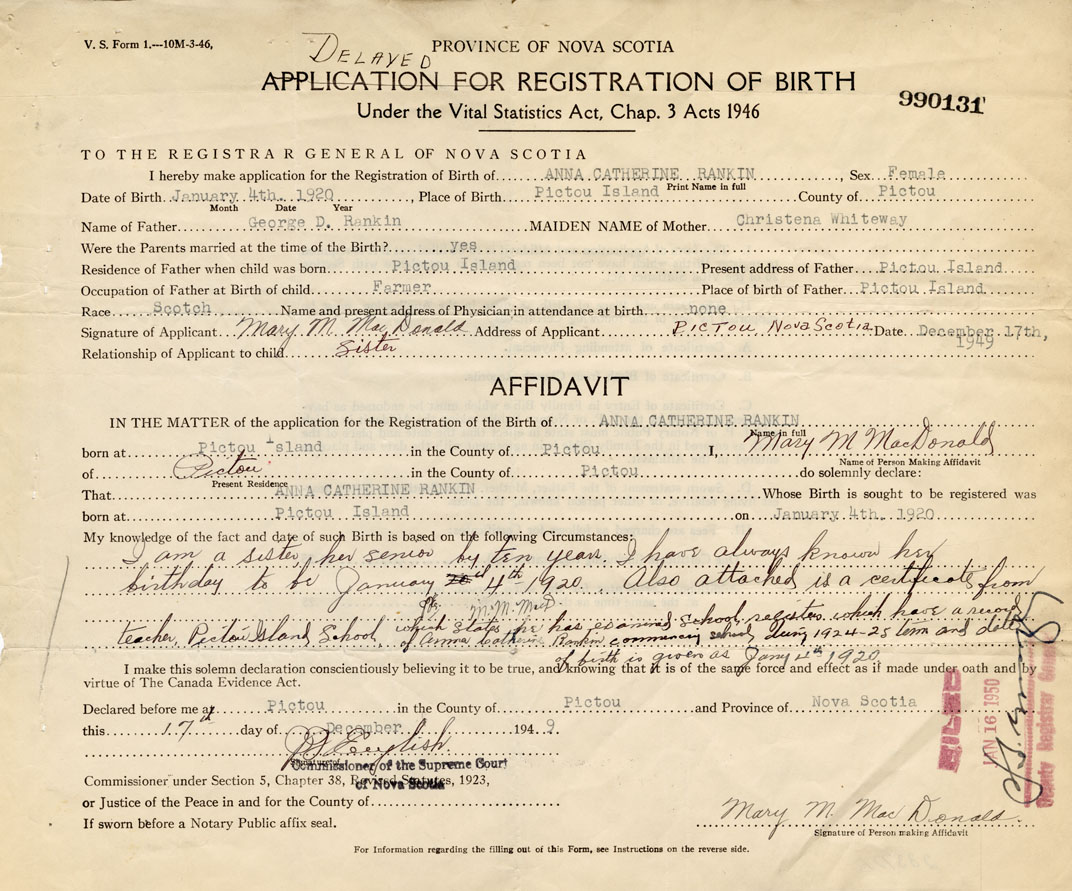 I am a sister her senior by ten years. I have always know her birthday to be January 4, 1920. Also attached is a certificate from teacher Pictou Island School which states she has examined school registers which have a record of Anna Catherine Rankin commencing school during 1924-25 term and date of birth is given as January 4, 1920
