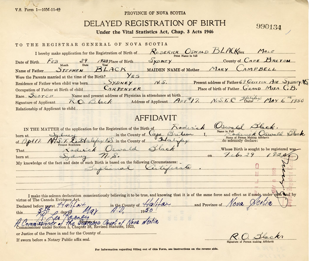 born at Sydney Cape Breton County on February 29, 1920