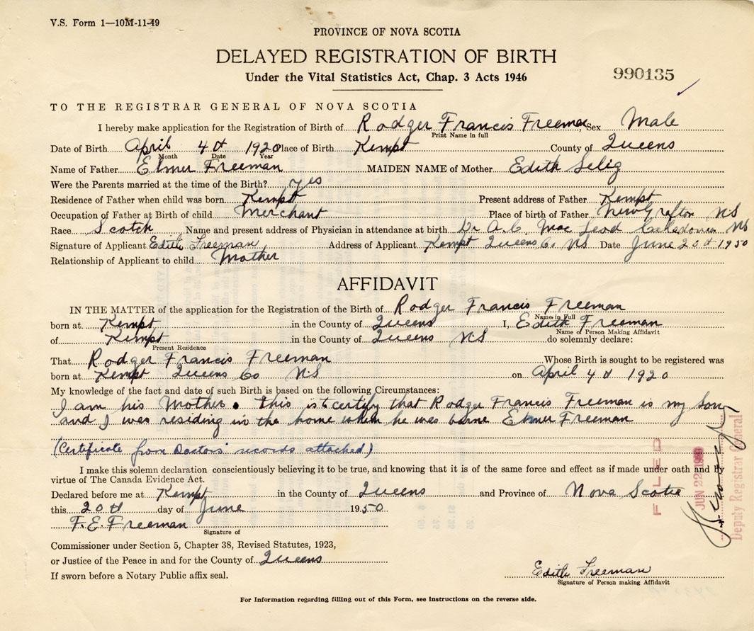 I am his Mother. This is to certify that Rodger Francis Freeman is my son and I was residing in the home which he was born Edith Freeman (Certificate from Doctor's records attached)