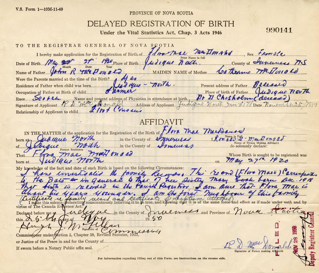 Date of Birth May 21, 1920 Place of Birth Judique NorthCounty of Inverness