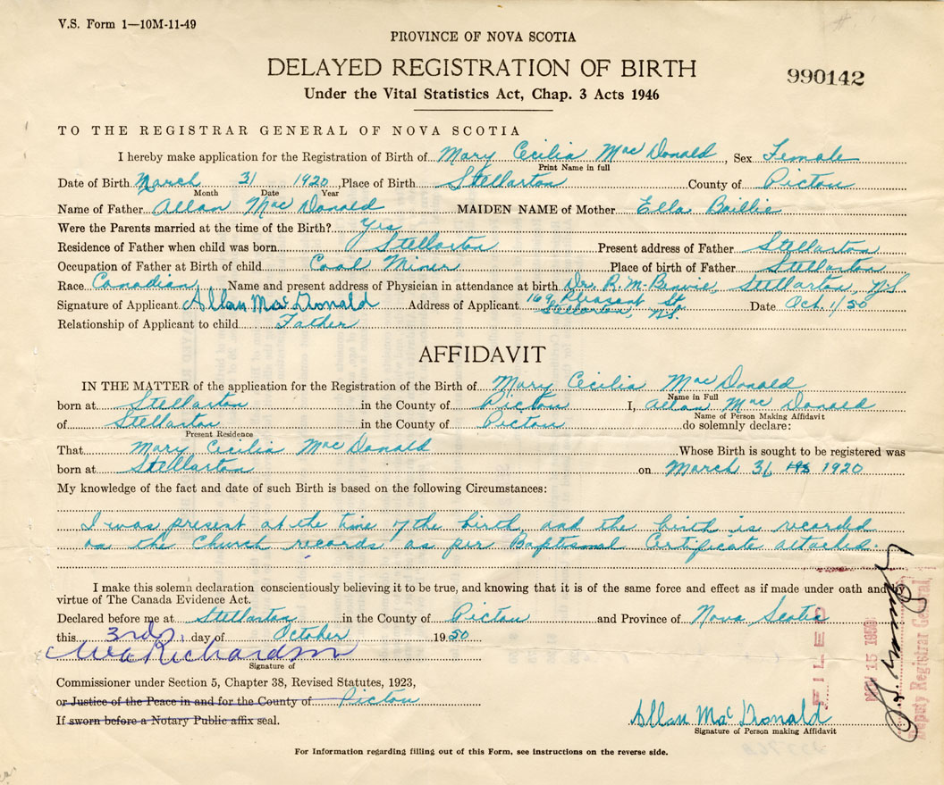Date of Birth March 31, 1920 Place of Birth StellartonCounty of Pictou