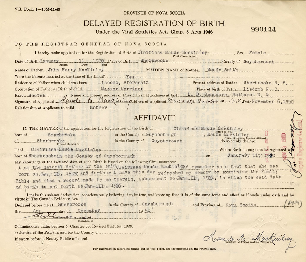 I am the natural Mother of the said Clairissa Maude MacKinlay and remember as a fact that she was born on Jan. 11, 1920 and further I have this day refreshed my memory by examining the Family Bible and find a record made by me therein, subsequent to Jan. 11, 1920, in which the said date of birth is set forth as Jan. 11, 1920