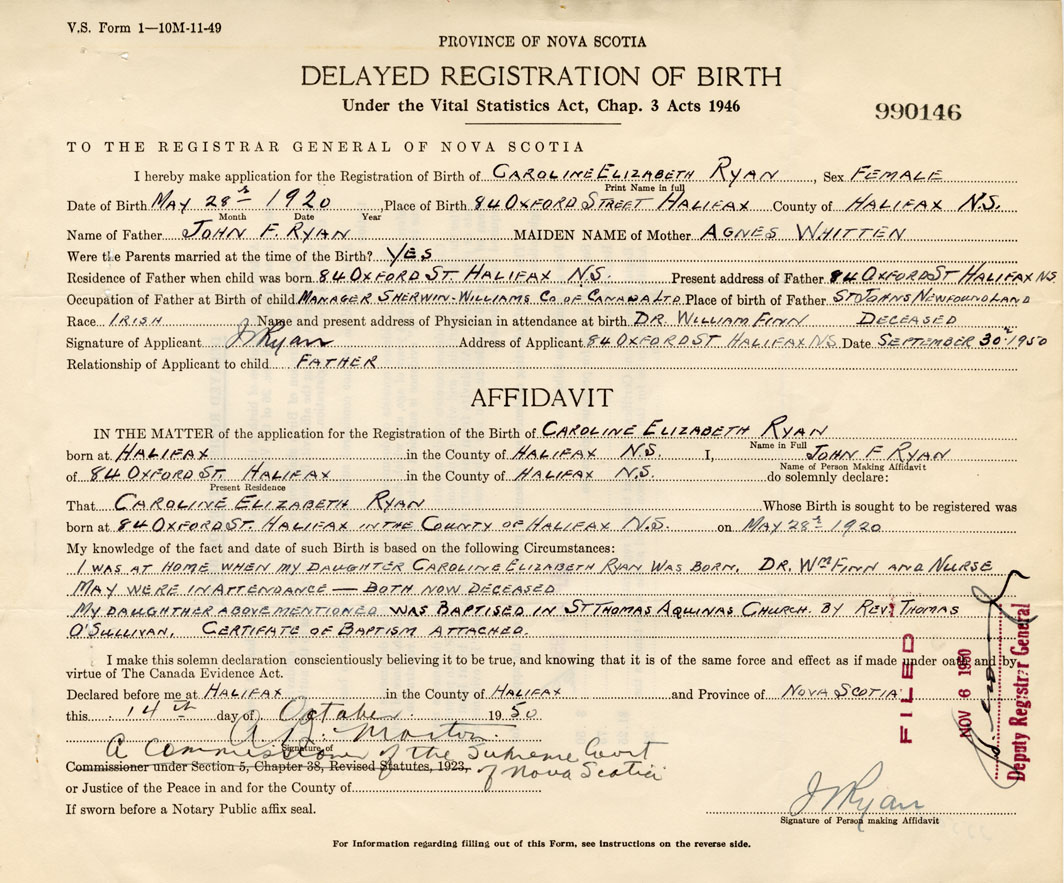 Signature of Applicant J. Ryan Address of Applicant 84 Oxford St. Halifax Date September 30, 1950