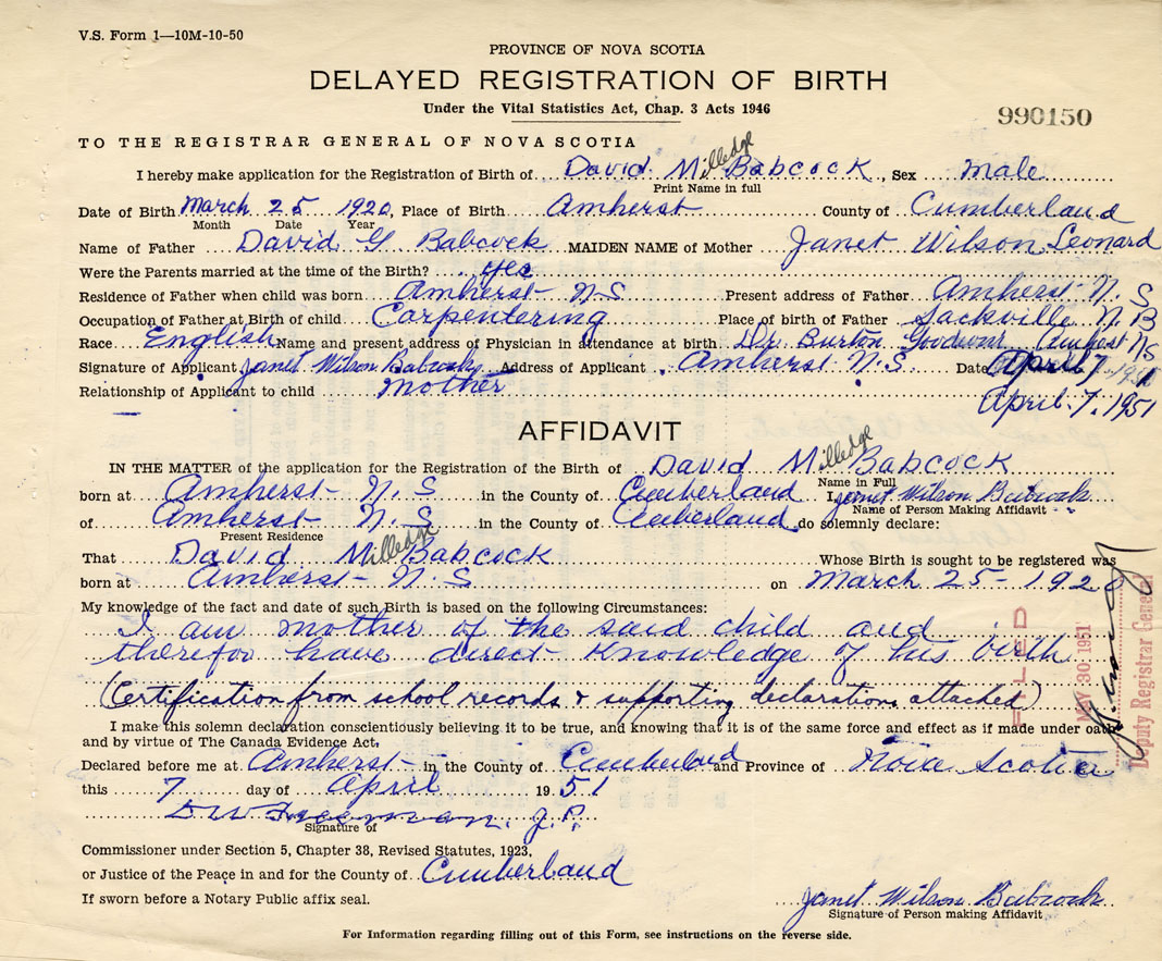 I hereby make application for the Registration of Birth of David MilledgeBabcock Sex Male