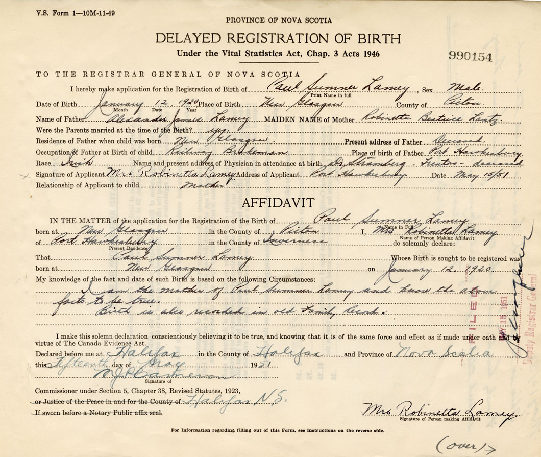 Date of Birth January 12, 1920 Place of Birth New GlasgowCounty of Pictou