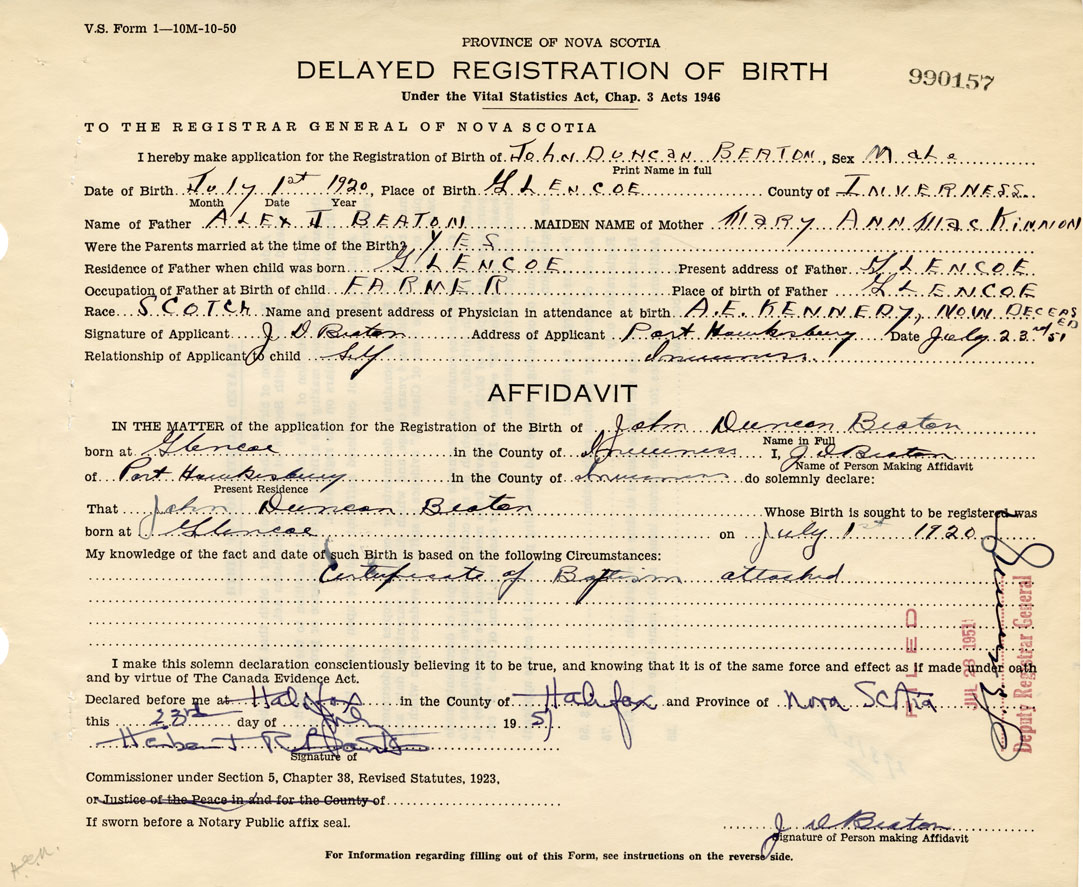 born at Glencoe Inverness County on July 1, 1920