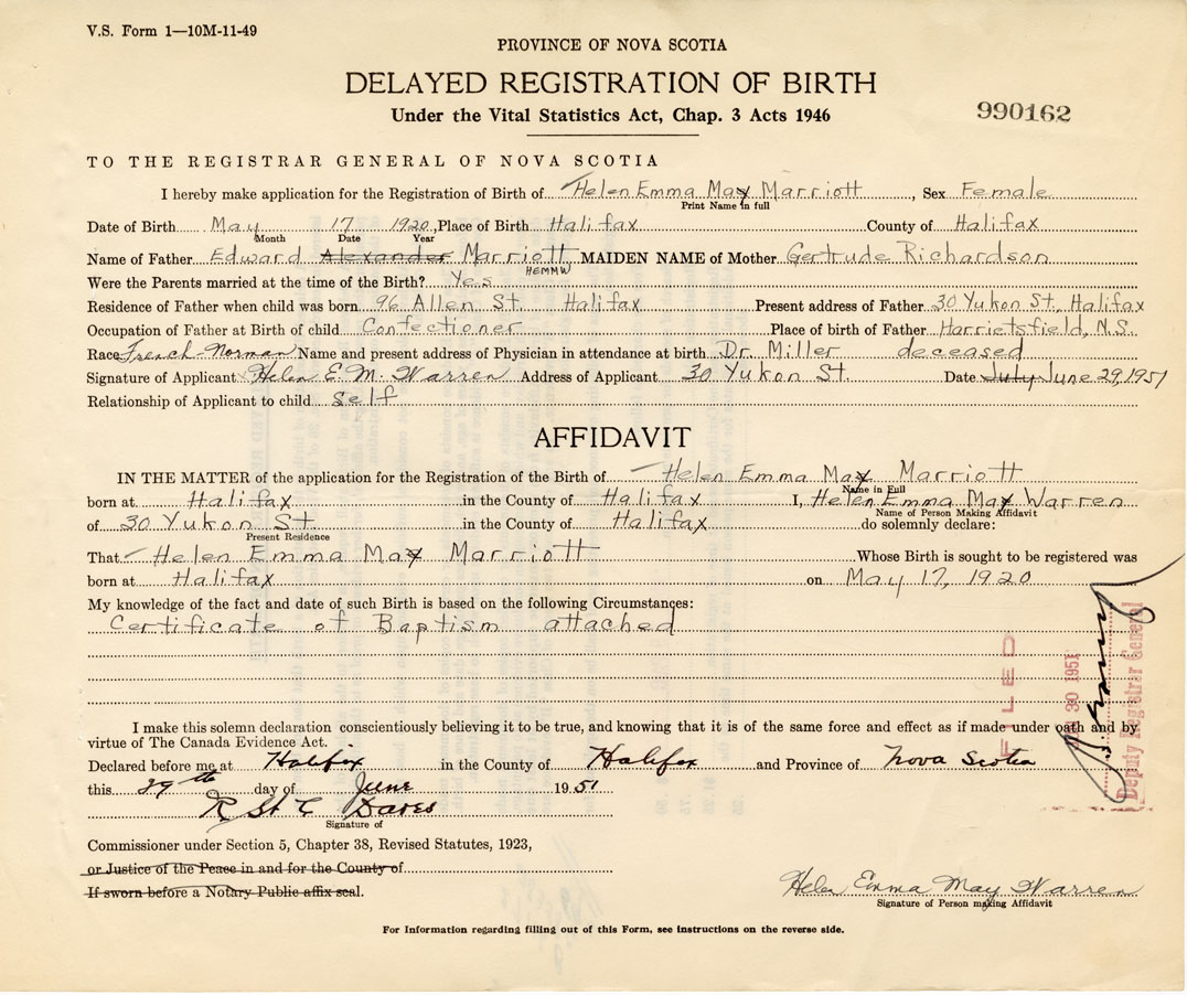 Signature of Applicant Helen E. M. Warren Address of Applicant 30 Yukon St. Halifax Date June 29, 1951
