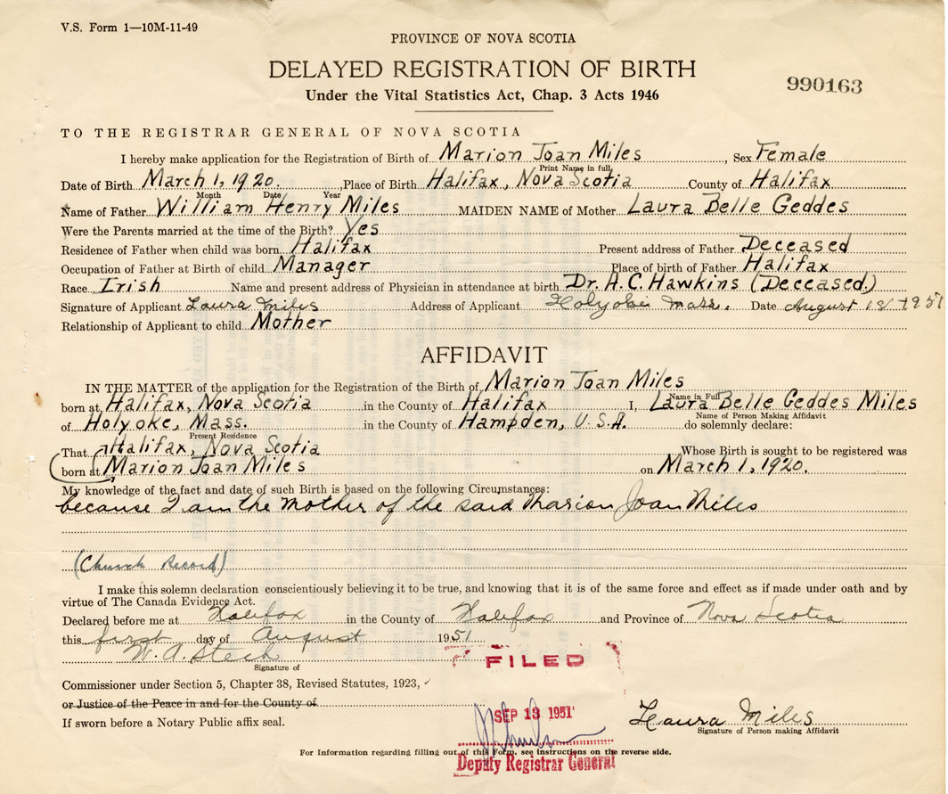 I hereby make application for the Registration of Birth of Marion JoanMiles Sex Female