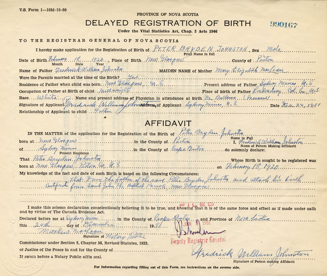 That I am the father of the said Peter Bryden Johnston and attached his birth certificate from Saint John the Baptist Parish, New Glasgow