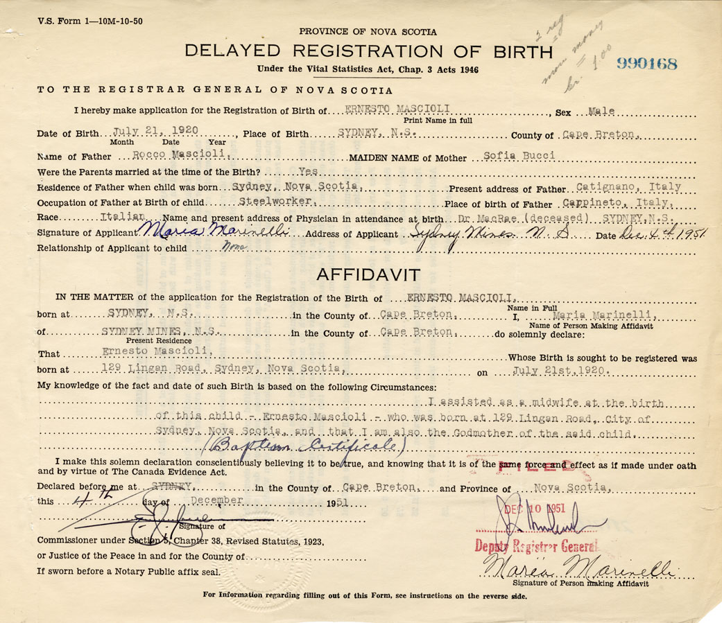 I assisted as a midwife at the birth of this child - Ernesto Muscioli - who was born at 129 Lingan Road, City of Sydney and I am also the Godmother of the said child. (Baptism Certificate)