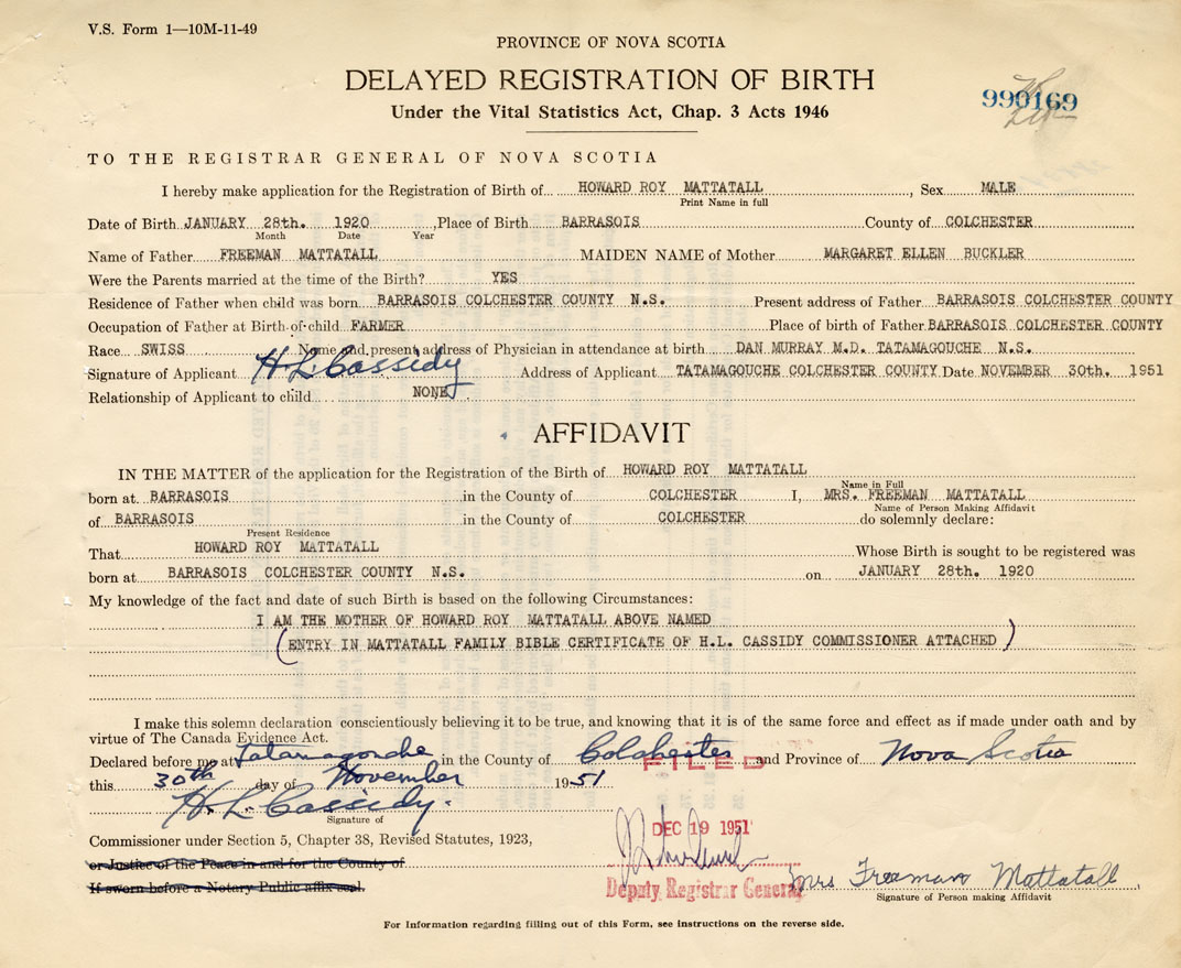 I am the mother of Howard Roy Mattatall above named (Entry in Mattatall Family Bible Certificate of H.L. Cassidy Commissioner Attached)