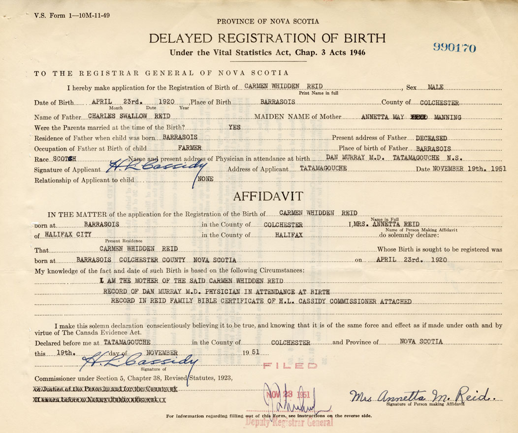 I am the Mother of the said Carmen Whidden Reid. Record of Dan Murray M.D. Physician in attendance at birth record in Reid Family Bible certificate of H.L. Cassidy Commissioner attached.
