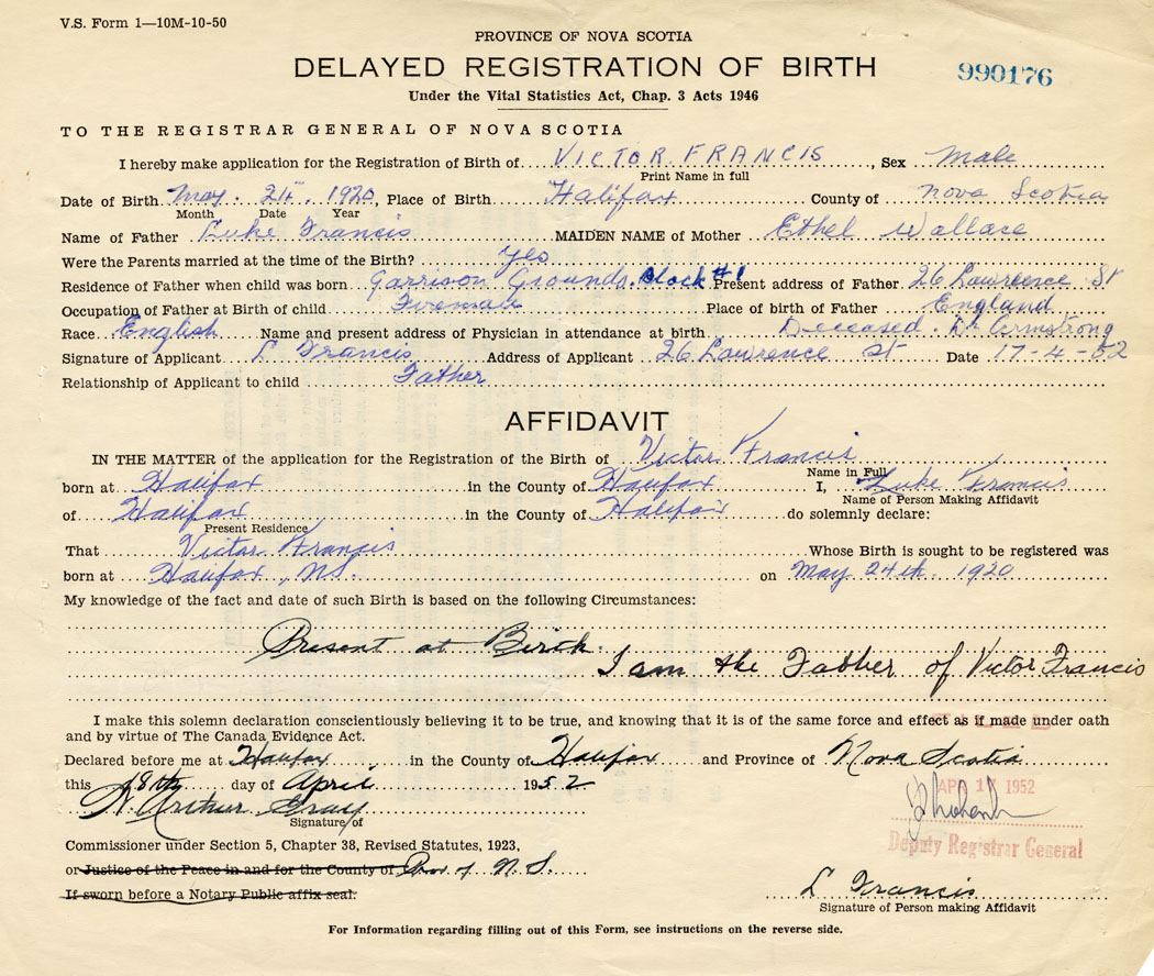 Signature of Applicant L Francis Address of Applicant 26 Lawrence St. Halifax Date April 17, 1952
