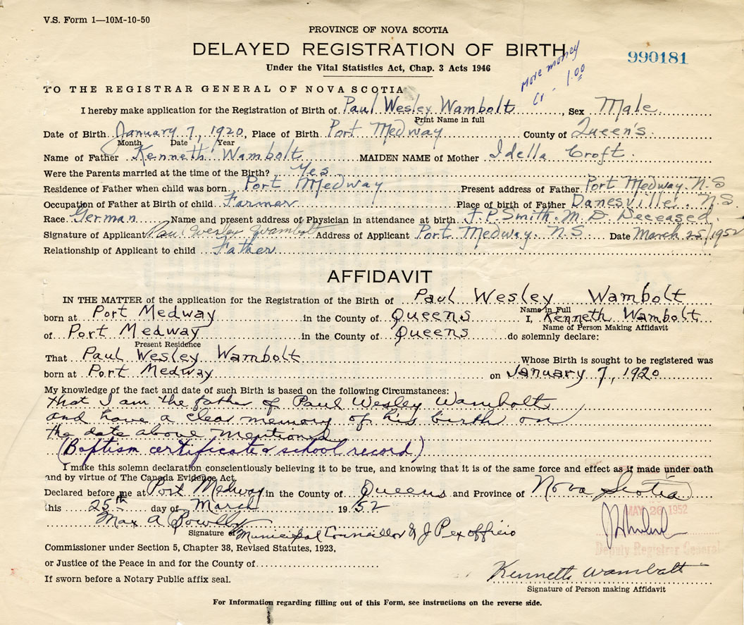 That I am the father of Paul Wesley Wambolt and have a clear memory of his birth on the date above mentioned (Baptism certificate and school record)