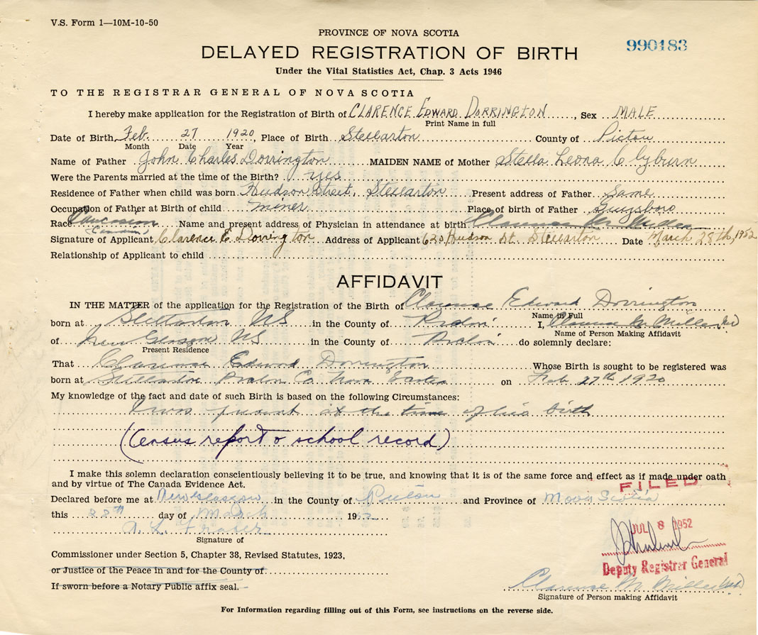 Signature of Applicant Clarence E. Dorrington Address of Applicant 620 Hudson St. Stellarton Date March 28, 1952