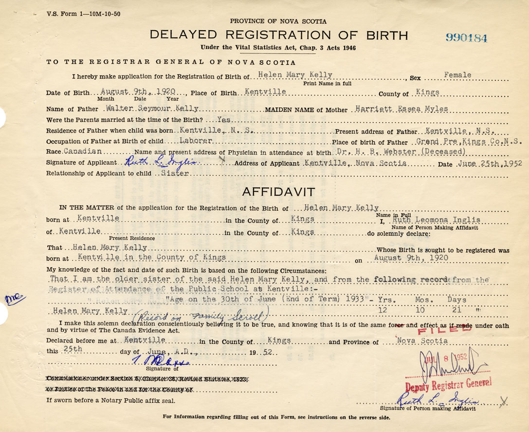 That I am the older sister of the said Helen Mary Kelly and from the following record from the Register of Attendance of the Public School at Kentville - Age on 30th of June (End of Term) 1933 - 12 years 10 months 21 days (Record on Family Scroll)