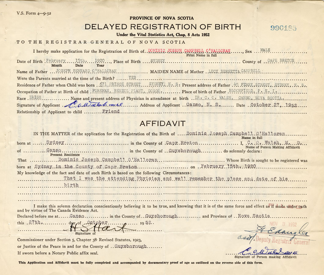 Date of Birth February 15, 1920 Place of Birth SydneyCounty of Cape Breton