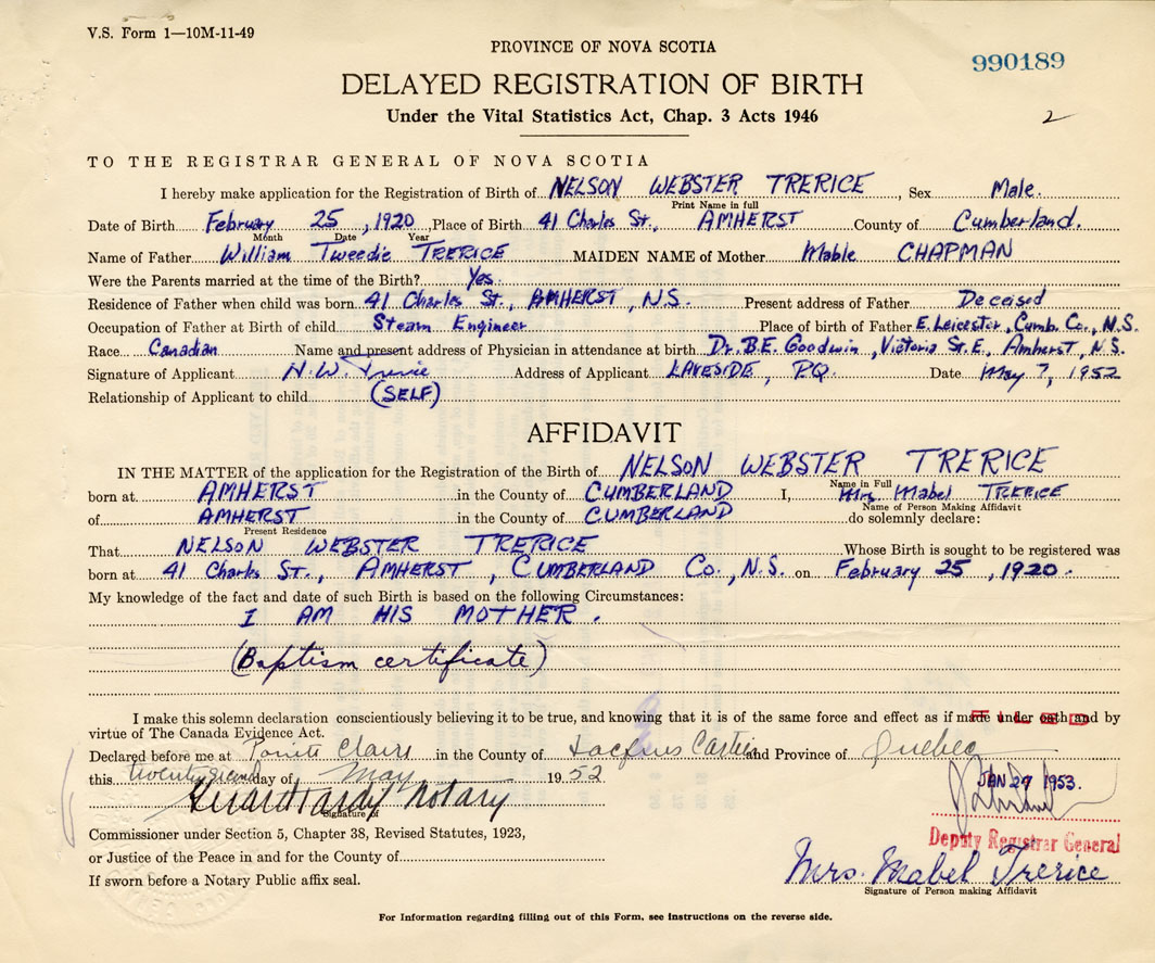 I hereby make application for the Registration of Birth of Nelson WebsterTrerice Sex Male