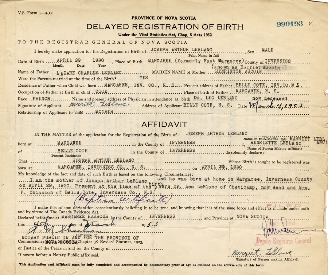 I am the mother of Joseph Arthur LeBlanc and he was born at home in Margaree, Inverness County on April 29, 1920. Present at the time of the birth were Dr. Leo LeBlanc of Cheticamp, now dead and Mrs. F. Chiasson of Belle Cote, Inverness Co. N.S. (Baptism certificate)