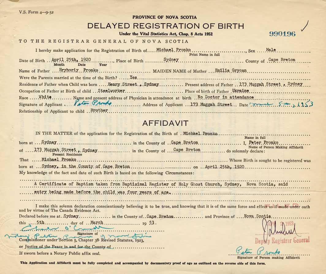 I hereby make application for the Registration of Birth of MichaelPronko Sex Male