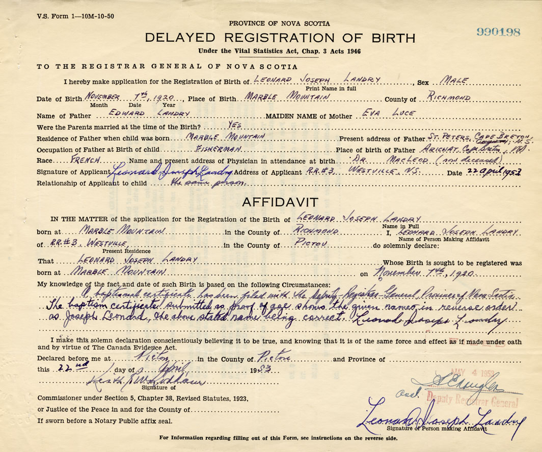 A baptismal certificate has been filed with the Deputy-Registrar-General Province of Nova Scotia. The baptism certificate submitted as proof of age shows the given names in reverse order as Joseph Leonard, the above stated name being correct. Leonard Joseph Landry