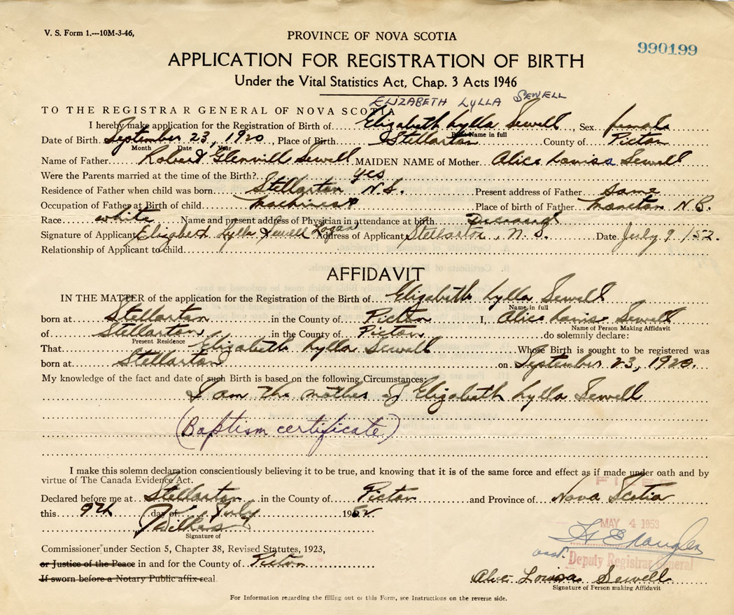 Date of Birth September 23, 1920 Place of Birth StellartonCounty of Pictou