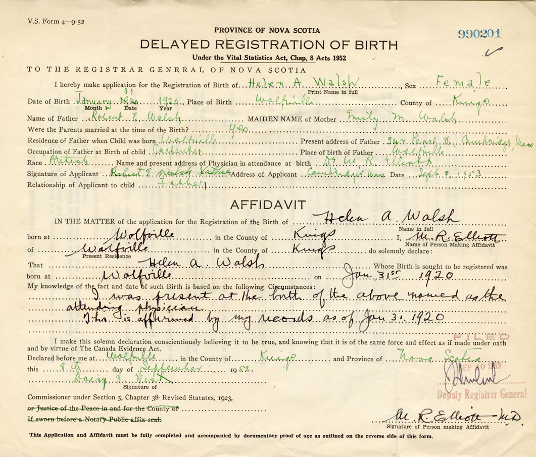 Date of Birth January 31, 1920 Place of Birth WolfvilleCounty of Kings