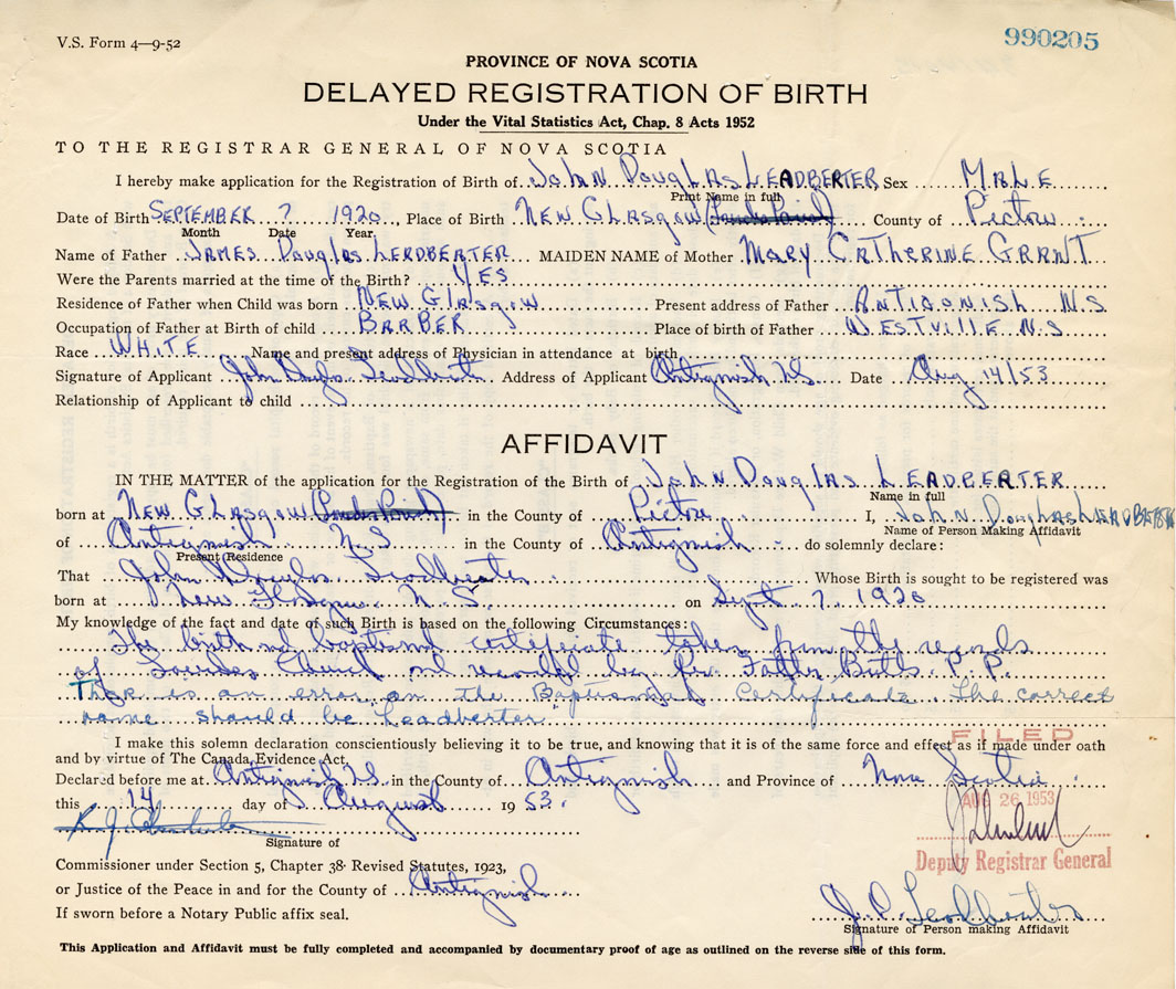 Date of Birth September 7, 1920 Place of Birth New GlasgowCounty of Pictou