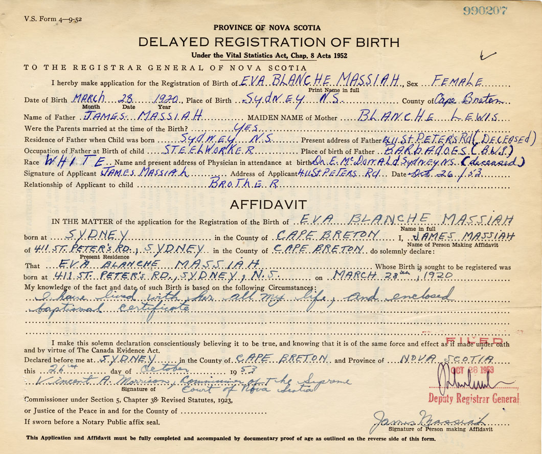 I hereby make application for the Registration of Birth of Eva BlancheMassiah Sex Female