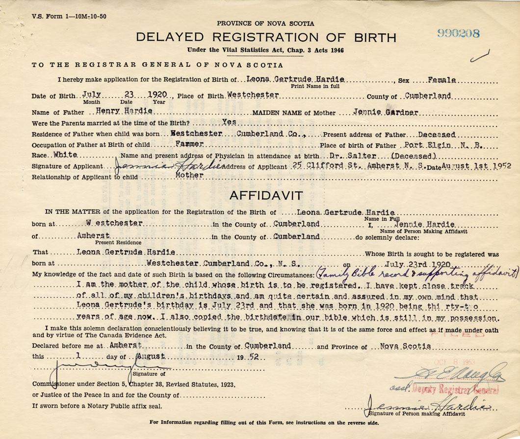 I am the mother of the child whose birth is to be registered. I have kept close track of all my children's birthdays and am quite certain and assured in my own mind that Leona Gertrude's birthday is July 23rd and that she was born in 1920 being thirty-two years of age now. I also copied the birth date in our bible which is still in my possession.