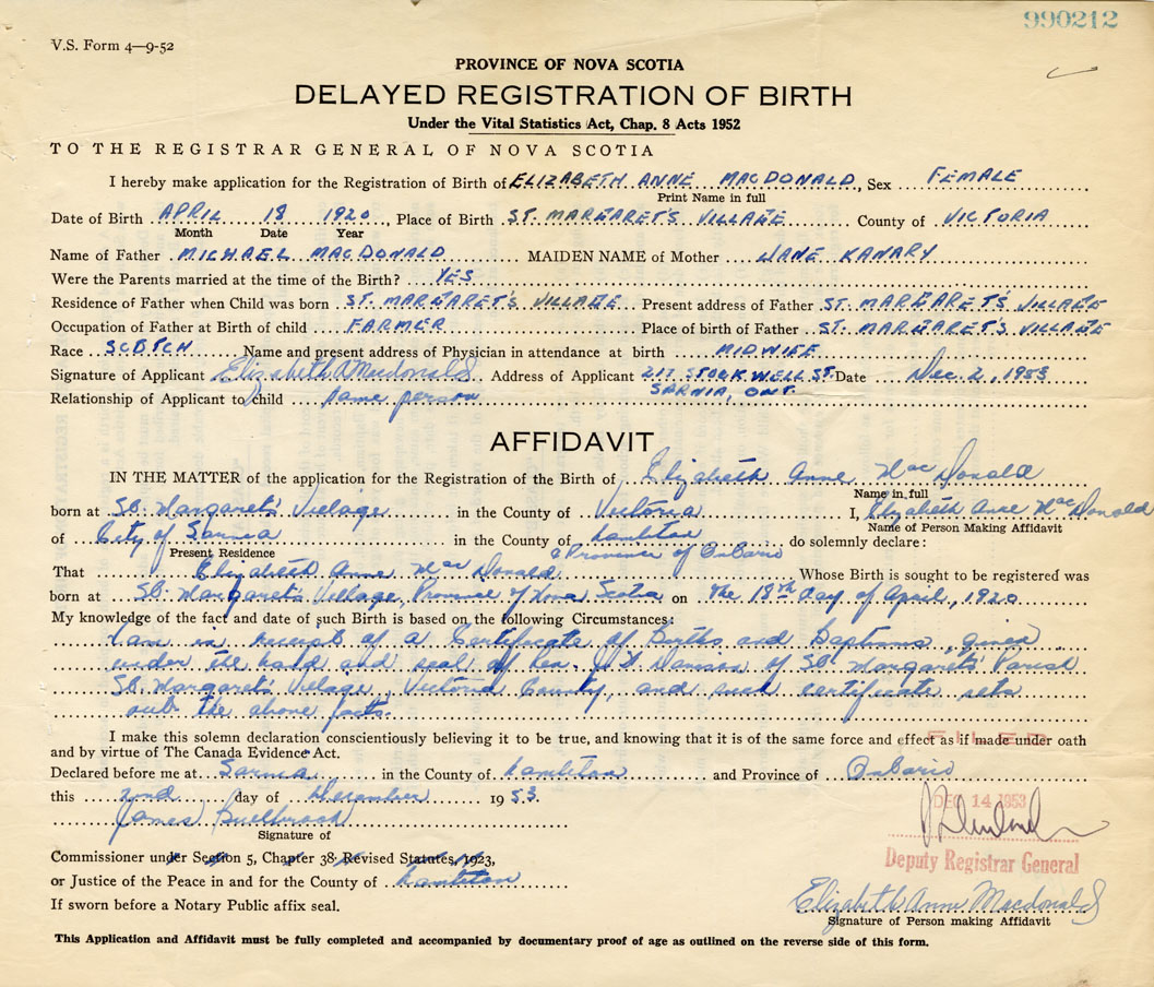 I hereby make application for the Registration of Birth of Elizabeth AnneMacDonald Sex Female