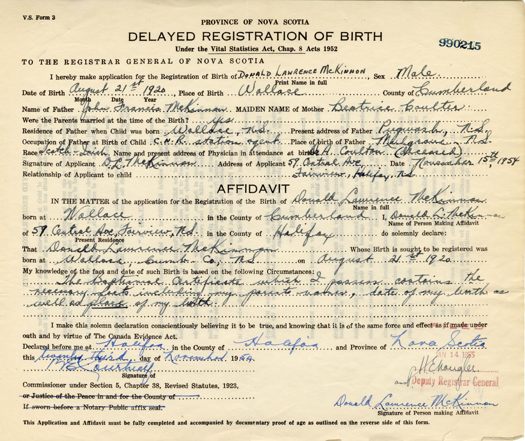 I hereby make application for the Registration of Birth of Donald LawrenceMcKinnon Sex Male
