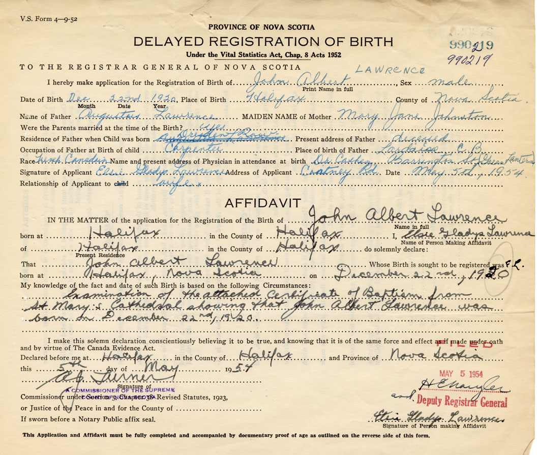 Examination of the attached certificate of Baptism from St. Mary's Cathedral, showing that John albert Lawrence was born on December 252nd, 1920