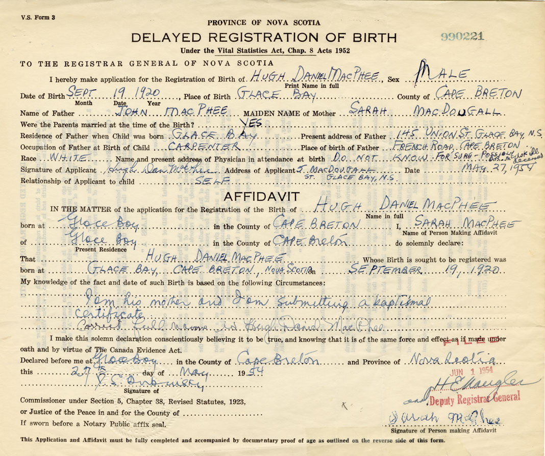Signature of Applicant Hugh Dan MacPhee Address of Applicant 5 MacDougall Street, Glace Bay, Cape Breton Co. Date 27 May 1954