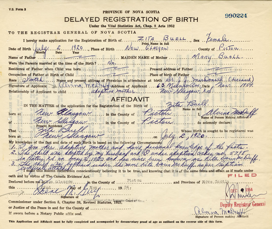 I am the adoptive mother and have personal knowledge of the facts. The child was adopted by my husband and I under adoption order no. 5798 in Pictou,NS on May 2, 1922 and has since been known as Rita Doris McDuff. The child was baptised under the name Rita Doris McDuff as per Baptism certificate attached.