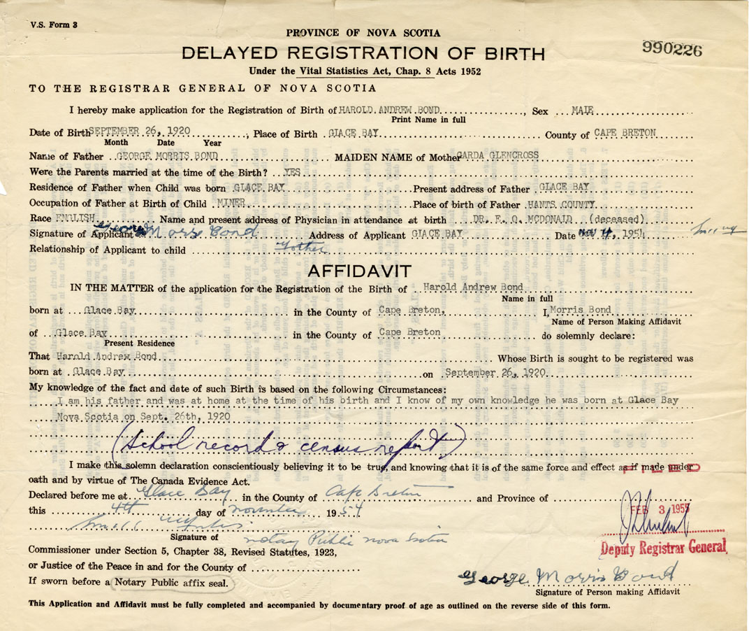I am his father and was home at the time of his birth and I know of my own knowledge he was born at Glace Bay Nova Scotia on September 26th, 1920.
