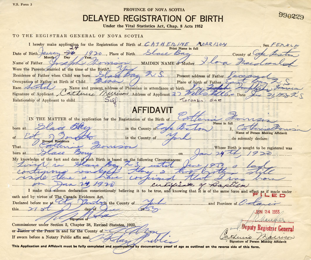 Lived in Glace Bay until June, 1950 & had a continuous residence there & two brothers reside there & have confirmed that I was born on Jan 24, 1920. Certificate of Baptism