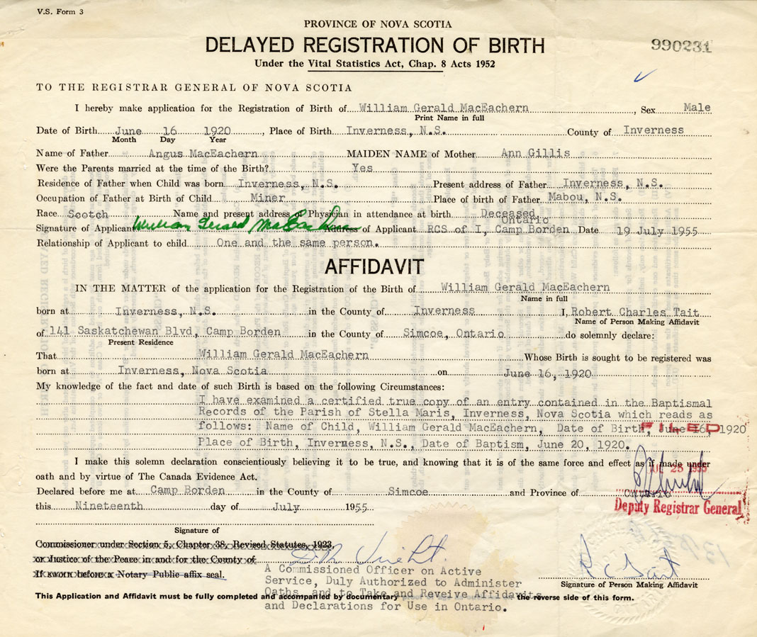 Signature of Applicant William Gerald MacEachern Address of Applicant RCS I, Camp Borden Date July 19, 1955