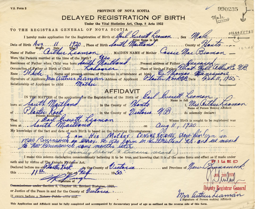 Date of Birth August 11, 1920 Place of Birth South MaitlandCounty of Hants