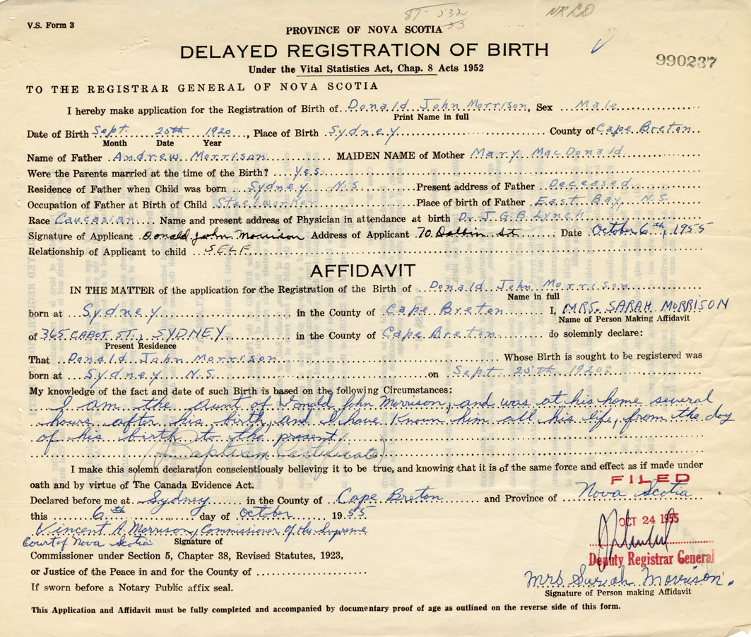 Date of Birth September 20, 1920 Place of Birth SydneyCounty of Cape Breton