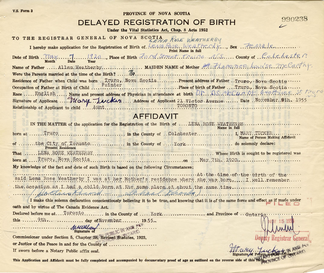 IN THE MATTER of the application for the Registration of the Birth of Lena Rose Weatherby