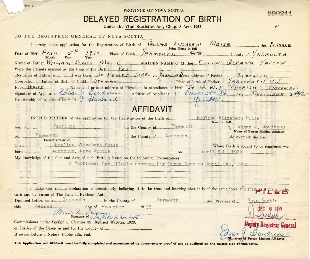 Name of Father William James Muise MAIDEN NAME of Mother Ellen Oceana Vaccon