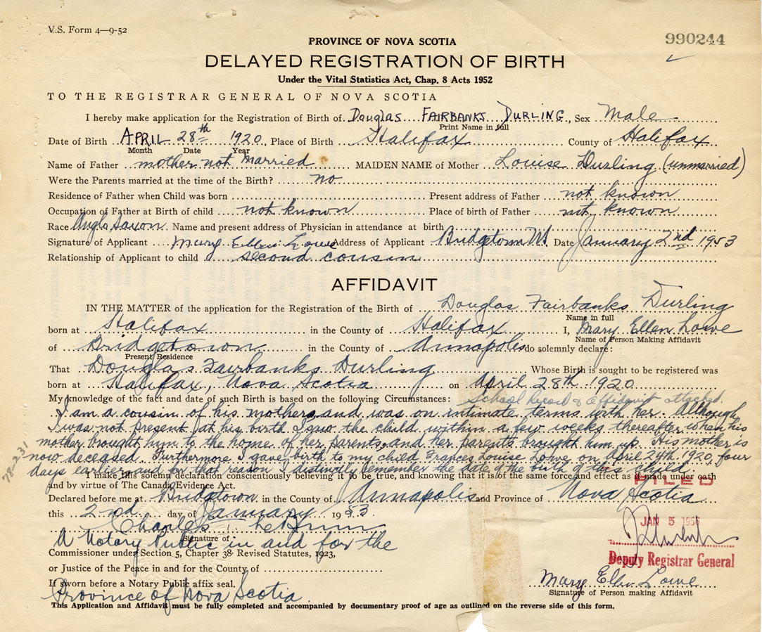 I hereby make application for the Registration of Birth of Douglas FairbanksDurling Sex Male