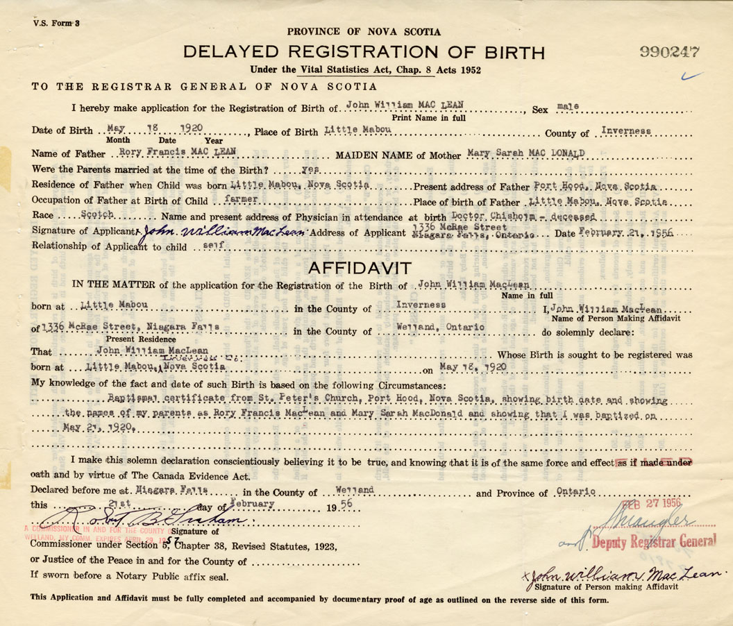Date of Birth May 18, 1920 Place of Birth Little MabouCounty of Inverness