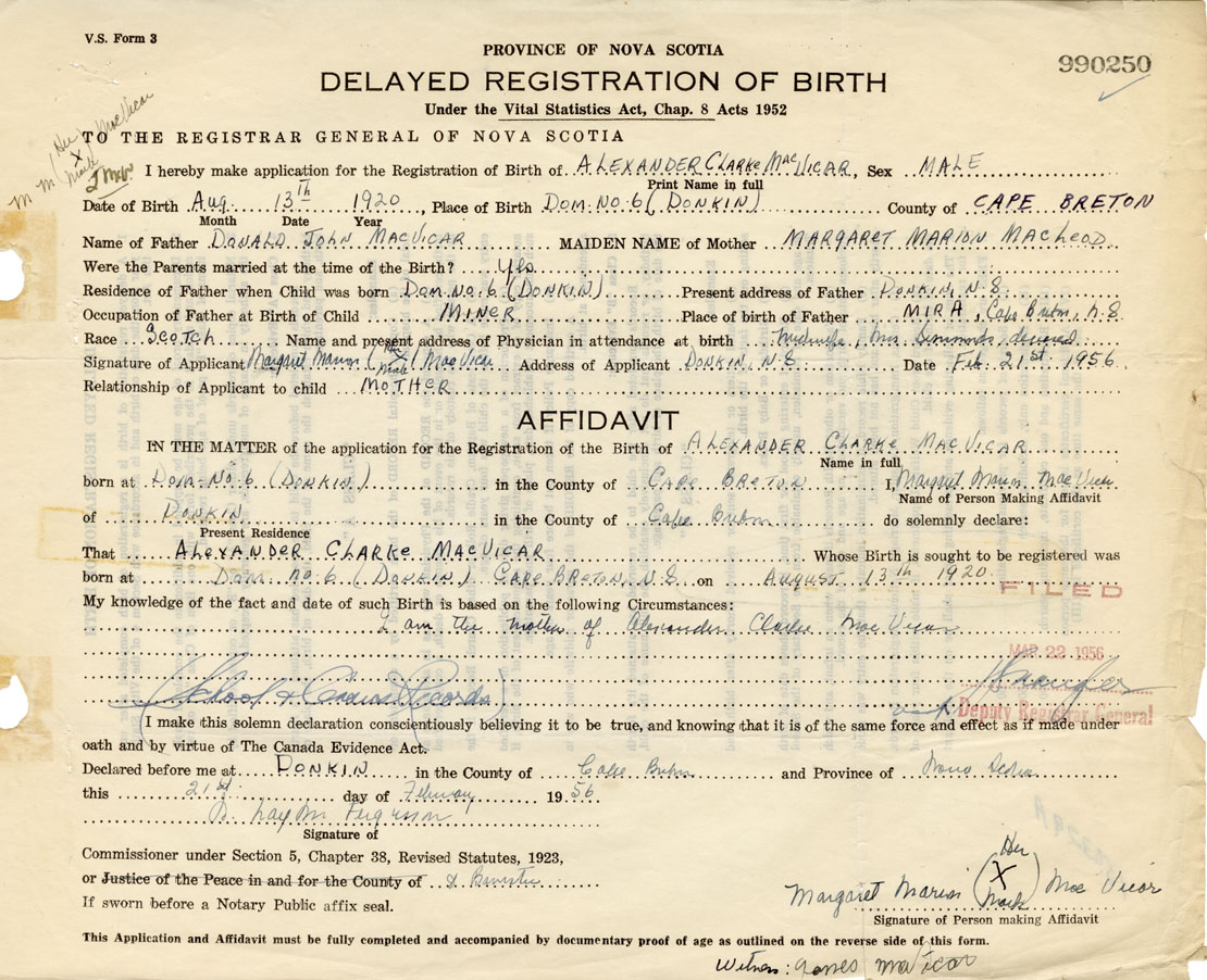 Signature of Applicant Margaret Marion MacVicar Address of Applicant Donkin, Cape Breton Co. Date 21 February 1956
