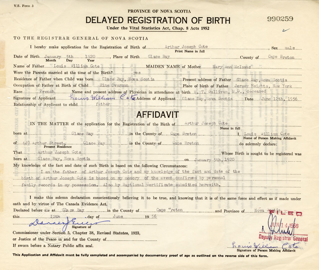 I hereby make application for the Registration of Birth of Arthur JosephCote Sex Male